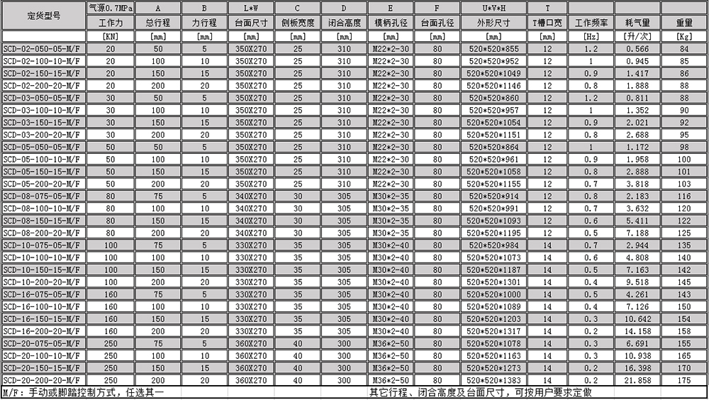 SCD指產品系列 02 指工作壓力 100指總行程 M/F指控制方式 M:手按 F:腳踏